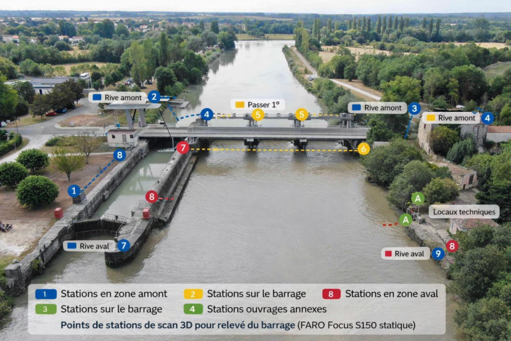 Schéma pédagogique – Points de stations de scan 3D pour relevé d’un barrage (technologie FARO Focus S150 statique)